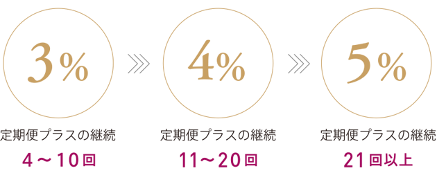4回以上定期便プラスを継続されたお客様には、特別なご優待として、購入ごとにお支払い金額の3%~ 5%のポイントが毎回つきます。ポイントは継続するほど還元率が上がり、最大5%を還元。毎回、お支払金額に対してポイントが加算され、1ポイント=1円としてお支払にご利用いただけます。