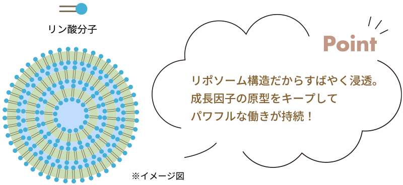 極小カプセルに包むことで、成長因子の原型を保つことができ、パワフルな働きをキープ。多重層のリ ポソーム構造に挟み込んだ成分が少しずつ放出され、みずみずしいハリ感が続きます。